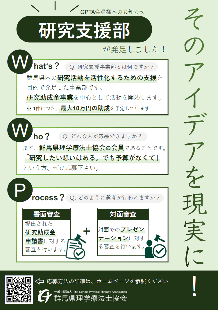 研究支援部の事業である研究助成金の申請が12月1日から開始いたします。 経験年数や研究歴を問わず、若手を含む幅広い層の理学療法士が研究に取り組めるよう支援する内容となっております。 皆様の研究活動が実りあるものとなるよう、サポートをしていきたいと思います。 詳しくはこちらの研究支援部のページをご確認ください。