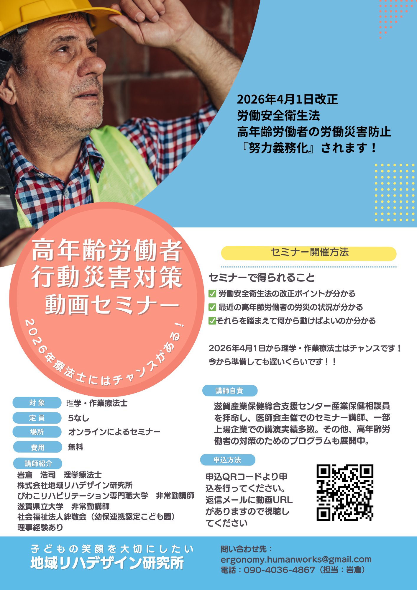 地域リハデザイン研究所主催「高年齢労働者 行動災害対策セミナー」開催のご案内が届きましたので、お知らせいたします。